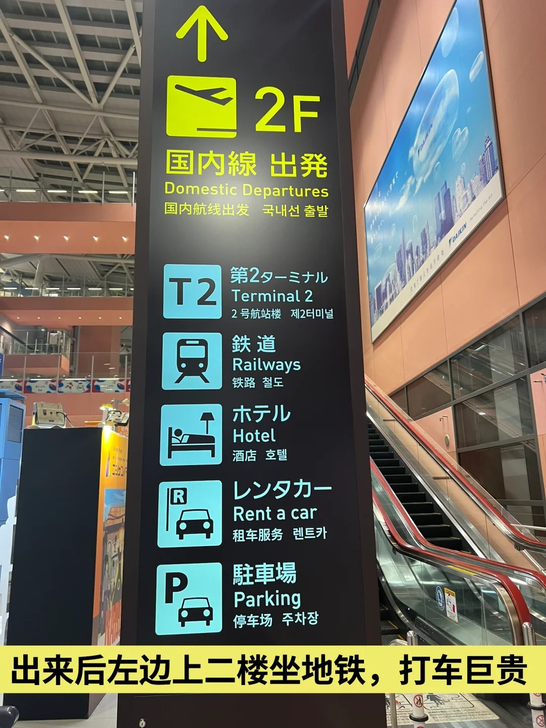 ▫️T1航站楼需坐2分钟接驳小火车(认准橘色「到着Arrivals」灯牌)