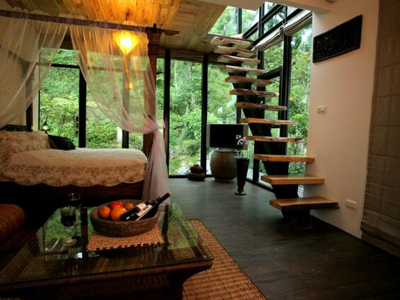 - 体验:这简直是梦中的房子!想象一下,住在四周都是落地玻璃的“森林小屋”里,睁眼就是满目青翠,阳光透过树叶洒进来…浪漫的纱幔大床,独特的旋转楼梯,让你仿佛置身童话世界。绝对是情侣度假、庆祝纪念日的顶级之选!