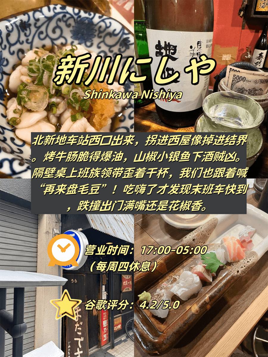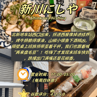 附必杀技+雷区提示+夜猫秘籍📍 1️⃣ 新川にしや(⏰17:00-05:00|⛔周四休|谷歌4.2) 🌙 深夜社畜の结界 “烤牛肠脆…