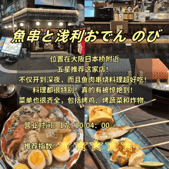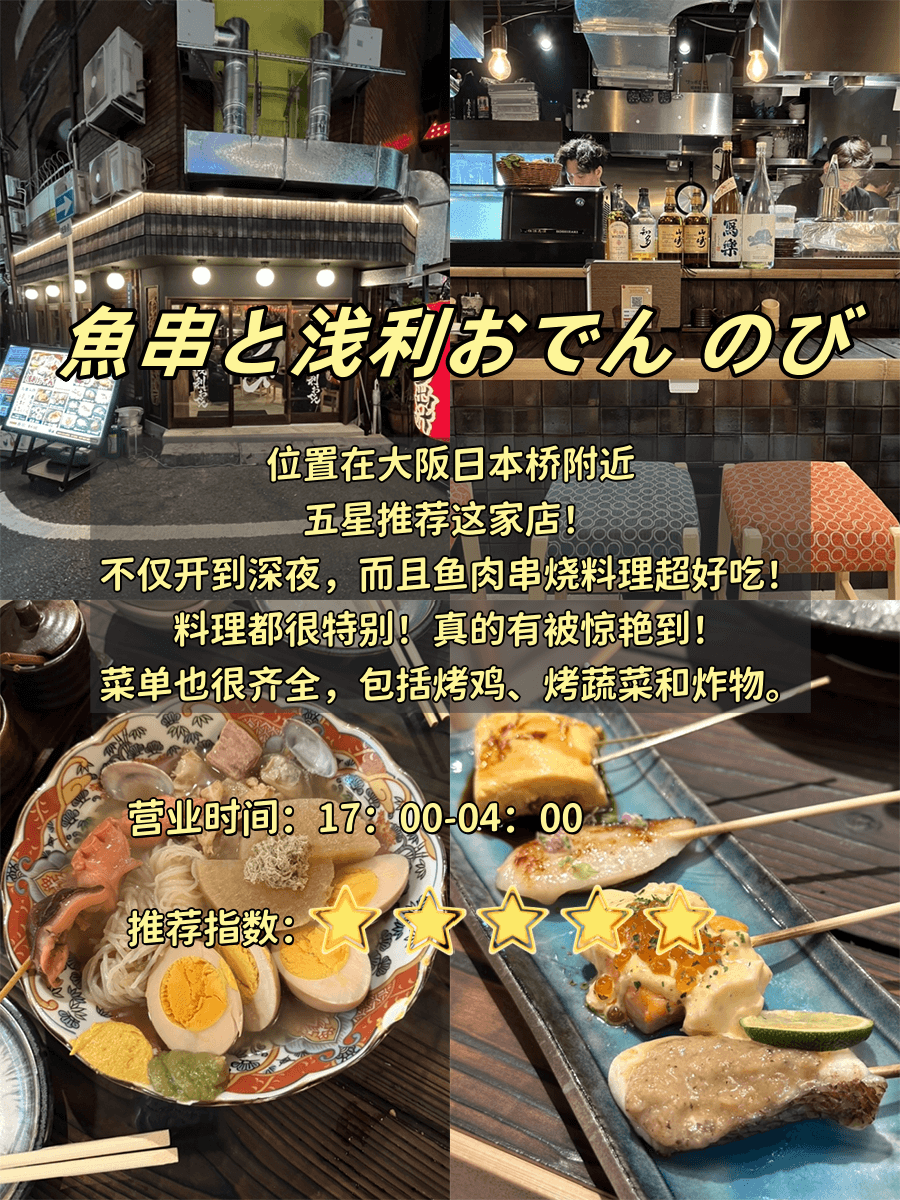 1. 魚串と浅利おでんのび 📍大阪日本桥|⏰下午5点—凌晨4点(夜猫福音!)👉 推给两种人:1️⃣ 爱关东煮暖胃的:它家汤底…