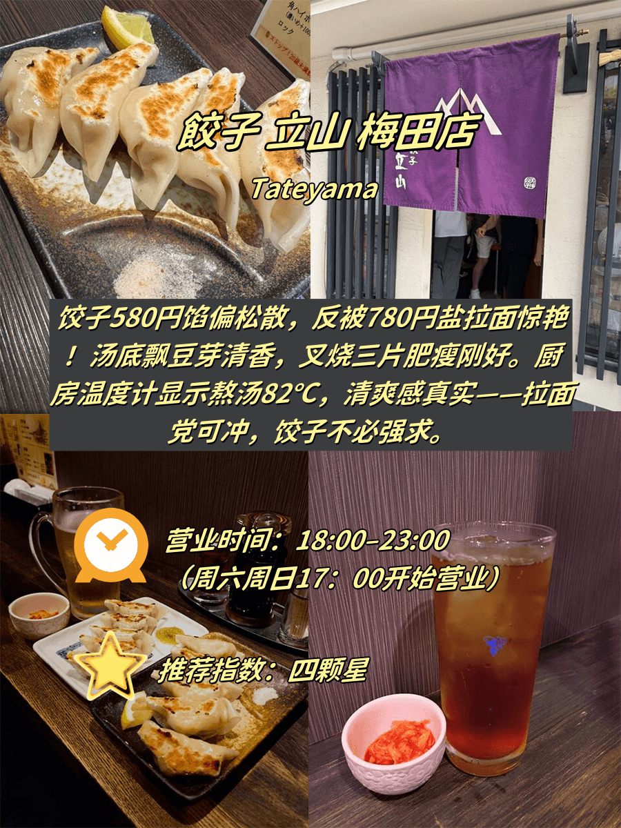 步行距离/人均/招牌菜全公开 1️⃣ 饺子立山(梅田店) 📍 心斋桥步行10分钟⏰ 18:00-23:00(周六日17:00开)|💰 人均8…