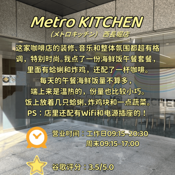 附营业时间+必点单品+谷歌评分📍 1️⃣ Metro KITCHEN 西長堀店 ⏰工作日9:15-20:30 / 周末9:15-17:00💻 社畜救…