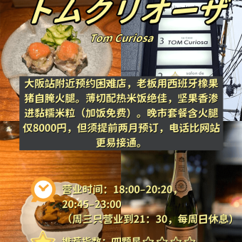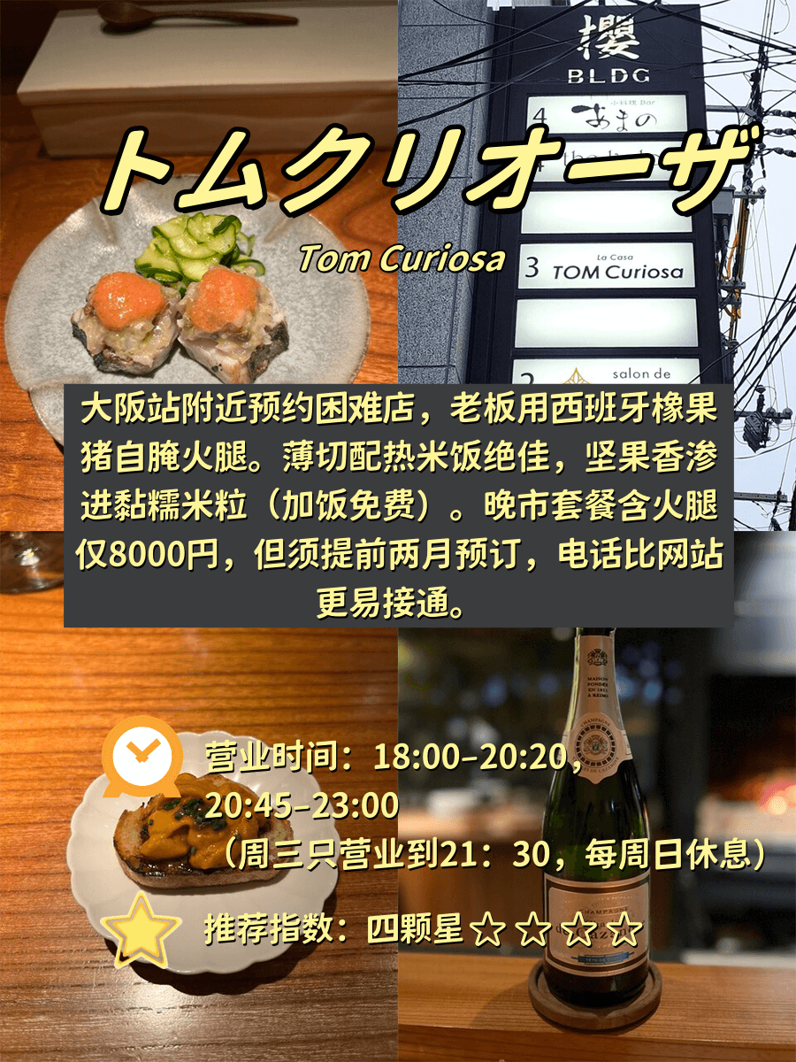 附预约难点+必点菜品+人均参考 1️⃣ トムクリオーザ(Tom Curiosa) 📍 大阪站步行5分钟|招牌“TOM Curiosa”⏰ 18…