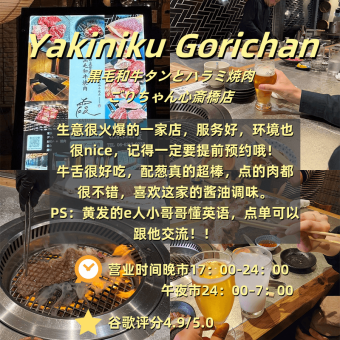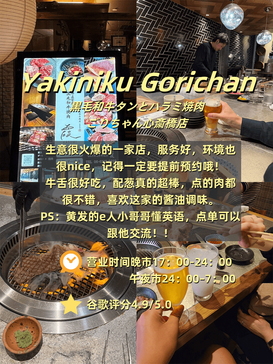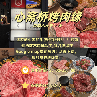 大阪的牛,是懂怎么让人心甘情愿胖三斤的🥩 1️⃣ 心斋桥烤肉缘|牛舌牛肠封神了!(📍心斋桥ARCHE商场5F)✅ 谷歌4.8高分实至名归! 厚切…